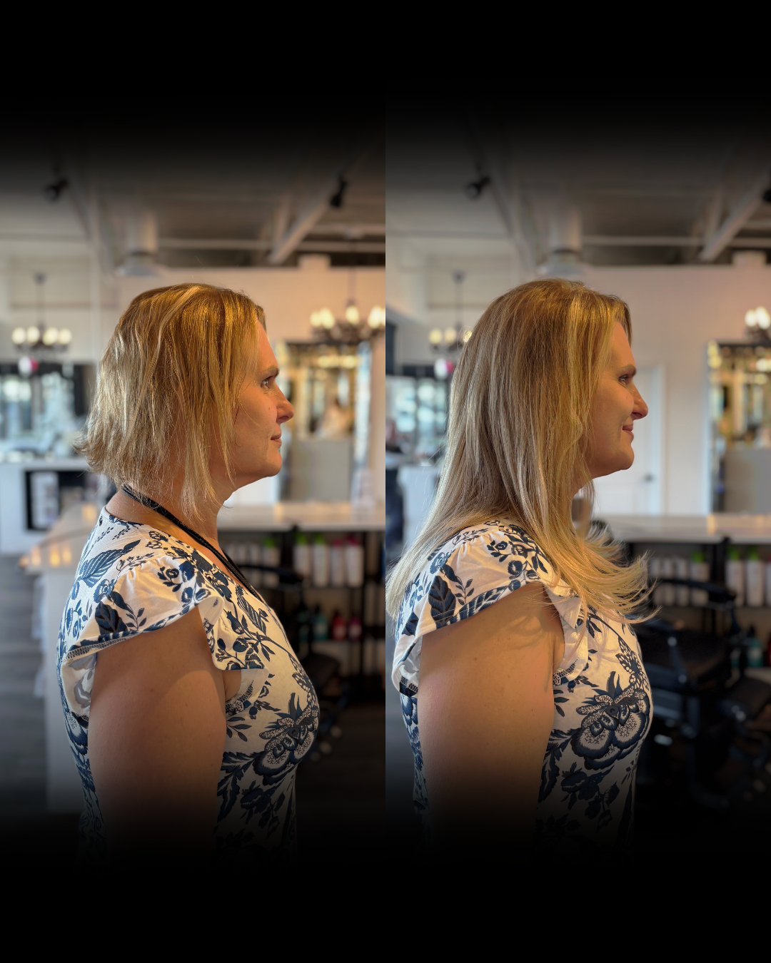 From brassy and short to creamy, long, and polished. Joanie corrected the color and added extensions for a total transformation.